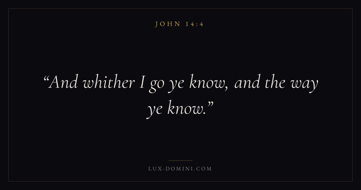 Books / John / Chapter 14 / Verse 4 ← John 14:3 John 14:4 John 14:5 → And whither I go ye know, and the way ye know. Download verse card Share on Twitter Share on Facebook Pin it ✦ Key themes LoveFaithAnxiety and fearTruthIncarnation Read with John 14:1John 14:2John 3:161 Corinthians 13:4 Related topics Bible verses about loveBible verses about faithBible verses about anxiety and fearBible verses about truth ✦ John Chapter 14 verses V. 1 V. 2 V. 3 V. 4 V. 5 V. 6 V. 7 V. 8 V. 9 V. 10 V. 11 V. 12 V. 13 V. 14 V. 15 V. 16 V. 17 V. 18 V. 19 V. 20 V. 21 V. 22 V. 23 V. 24 V. 25 V. 26 V. 27 V. 28 V. 29 V. 30 V. 31