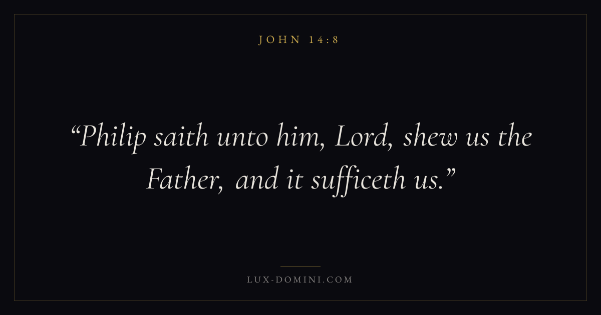 Books / John / Chapter 14 / Verse 8 ← John 14:7 John 14:8 John 14:9 → Philip saith unto him, Lord, shew us the Father, and it sufficeth us. Download verse card Share on Twitter Share on Facebook Pin it ✦ Key themes LoveFaithAnxiety and fearTruthIncarnation Read with John 14:7John 3:161 Corinthians 13:4Hebrews 11:1 Related topics Bible verses about loveBible verses about faithBible verses about anxiety and fearBible verses about truth ✦ John Chapter 14 verses V. 1 V. 2 V. 3 V. 4 V. 5 V. 6 V. 7 V. 8 V. 9 V. 10 V. 11 V. 12 V. 13 V. 14 V. 15 V. 16 V. 17 V. 18 V. 19 V. 20 V. 21 V. 22 V. 23 V. 24 V. 25 V. 26 V. 27 V. 28 V. 29 V. 30 V. 31