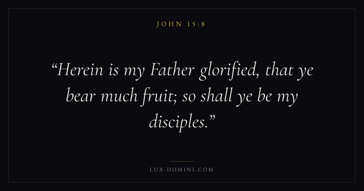 Books / John / Chapter 15 / Verse 8 ← John 15:7 John 15:8 John 15:9 → Herein is my Father glorified, that ye bear much fruit; so shall ye be my disciples. Download verse card Share on Twitter Share on Facebook Pin it ✦ Key themes LoveFaithTruthIncarnation Read with John 15:9John 3:161 Corinthians 13:4Hebrews 11:1 Related topics Bible verses about loveBible verses about faithBible verses about truth ✦ John Chapter 15 verses V. 1 V. 2 V. 3 V. 4 V. 5 V. 6 V. 7 V. 8 V. 9 V. 10 V. 11 V. 12 V. 13 V. 14 V. 15 V. 16 V. 17 V. 18 V. 19 V. 20 V. 21 V. 22 V. 23 V. 24 V. 25 V. 26 V. 27