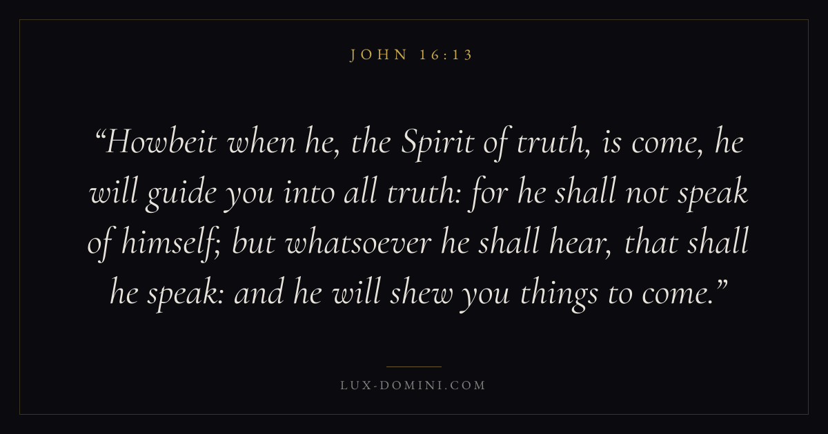Howbeit when he, the Spirit of truth, is come, he will guide you into all truth: for he shall not speak of himself; but whatsoever he shall hear, that shall he speak: and he will shew you things to come.