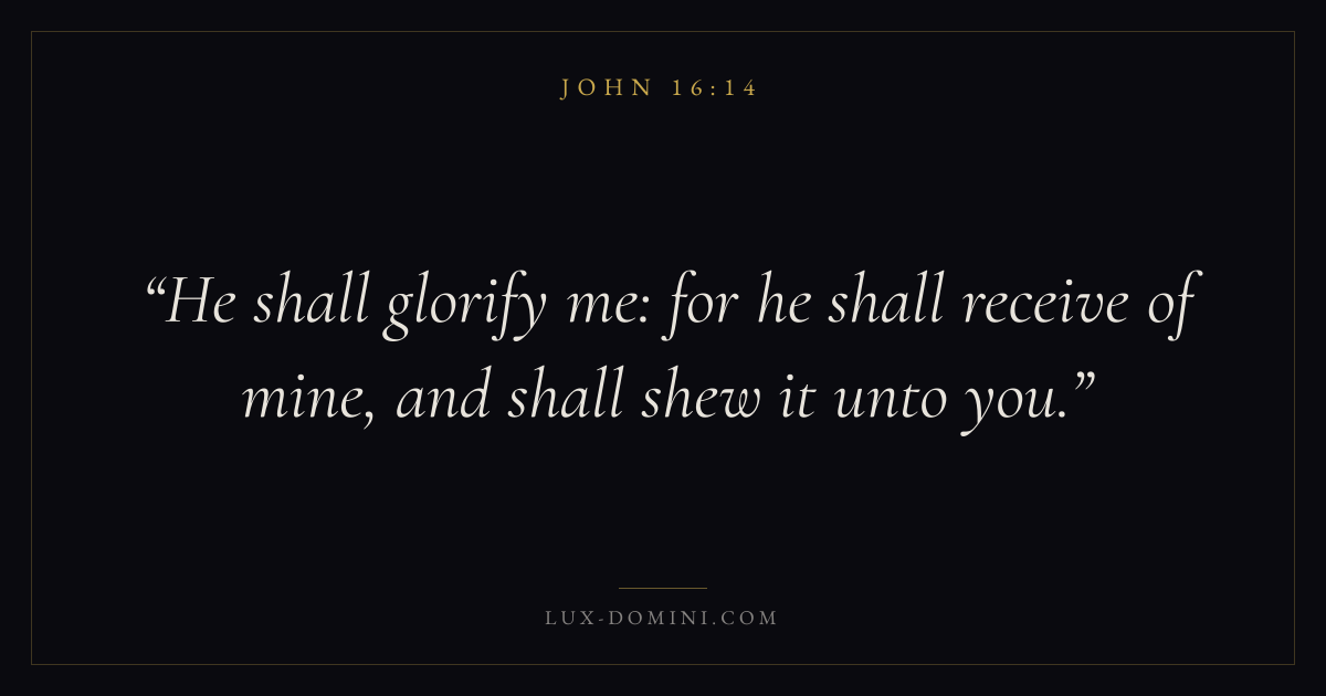 Books / John / Chapter 16 / Verse 14 ← John 16:13 John 16:14 John 16:15 → He shall glorify me: for he shall receive of mine, and shall shew it unto you. Download verse card Share on Twitter Share on Facebook Pin it ✦ Key themes LoveFaithTruthIncarnation Read with John 16:15John 3:161 Corinthians 13:4Hebrews 11:1 Related topics Bible verses about loveBible verses about faithBible verses about truth ✦ John Chapter 16 verses V. 1 V. 2 V. 3 V. 4 V. 5 V. 6 V. 7 V. 8 V. 9 V. 10 V. 11 V. 12 V. 13 V. 14 V. 15 V. 16 V. 17 V. 18 V. 19 V. 20 V. 21 V. 22 V. 23 V. 24 V. 25 V. 26 V. 27 V. 28 V. 29 V. 30 V. 31 V. 32 V. 33