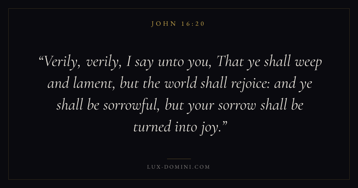 Verily, verily, I say unto you, That ye shall weep and lament, but the world shall rejoice: and ye shall be sorrowful, but your sorrow shall be turned into joy.