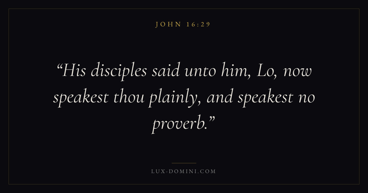 Books / John / Chapter 16 / Verse 29 ← John 16:28 John 16:29 John 16:30 → His disciples said unto him, Lo, now speakest thou plainly, and speakest no proverb. Download verse card Share on Twitter Share on Facebook Pin it ✦ Key themes LoveFaithTruthIncarnation Read with John 16:30John 3:161 Corinthians 13:4Hebrews 11:1 Related topics Bible verses about loveBible verses about faithBible verses about truth ✦ John Chapter 16 verses V. 1 V. 2 V. 3 V. 4 V. 5 V. 6 V. 7 V. 8 V. 9 V. 10 V. 11 V. 12 V. 13 V. 14 V. 15 V. 16 V. 17 V. 18 V. 19 V. 20 V. 21 V. 22 V. 23 V. 24 V. 25 V. 26 V. 27 V. 28 V. 29 V. 30 V. 31 V. 32 V. 33