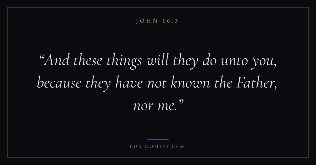Books / John / Chapter 16 / Verse 3 ← John 16:2 John 16:3 John 16:4 → And these things will they do unto you, because they have not known the Father, nor me. Download verse card Share on Twitter Share on Facebook Pin it ✦ Key themes LoveFaithAnxiety and fearTruthIncarnation Read with John 16:2John 16:4John 3:161 Corinthians 13:4 Related topics Bible verses about loveBible verses about faithBible verses about anxiety and fearBible verses about truth ✦ John Chapter 16 verses V. 1 V. 2 V. 3 V. 4 V. 5 V. 6 V. 7 V. 8 V. 9 V. 10 V. 11 V. 12 V. 13 V. 14 V. 15 V. 16 V. 17 V. 18 V. 19 V. 20 V. 21 V. 22 V. 23 V. 24 V. 25 V. 26 V. 27 V. 28 V. 29 V. 30 V. 31 V. 32 V. 33