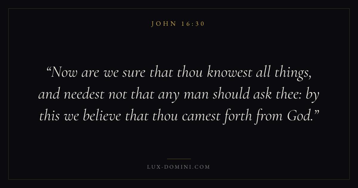 Now are we sure that thou knowest all things, and needest not that any man should ask thee: by this we believe that thou camest forth from God.
