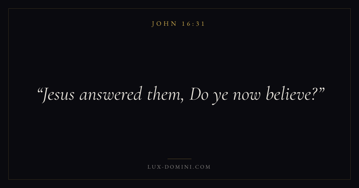 Books / John / Chapter 16 / Verse 31 ← John 16:30 John 16:31 John 16:32 → Jesus answered them, Do ye now believe? Download verse card Share on Twitter Share on Facebook Pin it ✦ Key themes LoveFaithTruthIncarnation Read with John 16:32John 16:33John 3:161 Corinthians 13:4 Related topics Bible verses about loveBible verses about faithBible verses about truth ✦ John Chapter 16 verses V. 1 V. 2 V. 3 V. 4 V. 5 V. 6 V. 7 V. 8 V. 9 V. 10 V. 11 V. 12 V. 13 V. 14 V. 15 V. 16 V. 17 V. 18 V. 19 V. 20 V. 21 V. 22 V. 23 V. 24 V. 25 V. 26 V. 27 V. 28 V. 29 V. 30 V. 31 V. 32 V. 33