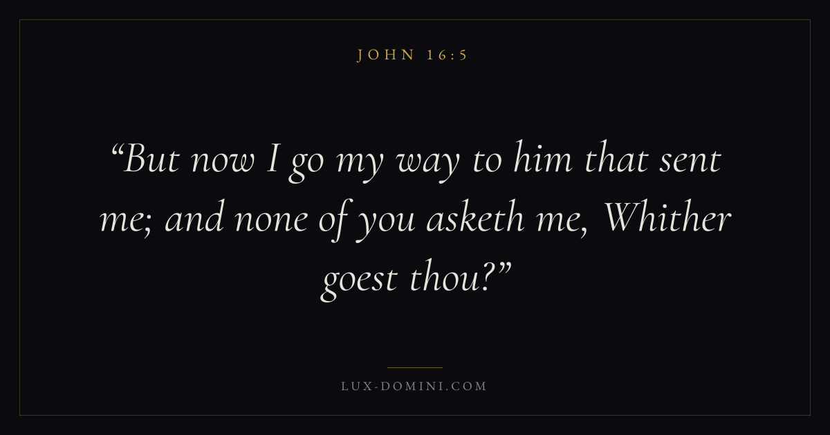 Books / John / Chapter 16 / Verse 5 ← John 16:4 John 16:5 John 16:6 → But now I go my way to him that sent me; and none of you asketh me, Whither goest thou? Download verse card Share on Twitter Share on Facebook Pin it ✦ Key themes LoveFaithAnxiety and fearTruthIncarnation Read with John 16:2John 16:3John 3:161 Corinthians 13:4 Related topics Bible verses about loveBible verses about faithBible verses about anxiety and fearBible verses about truth ✦ John Chapter 16 verses V. 1 V. 2 V. 3 V. 4 V. 5 V. 6 V. 7 V. 8 V. 9 V. 10 V. 11 V. 12 V. 13 V. 14 V. 15 V. 16 V. 17 V. 18 V. 19 V. 20 V. 21 V. 22 V. 23 V. 24 V. 25 V. 26 V. 27 V. 28 V. 29 V. 30 V. 31 V. 32 V. 33