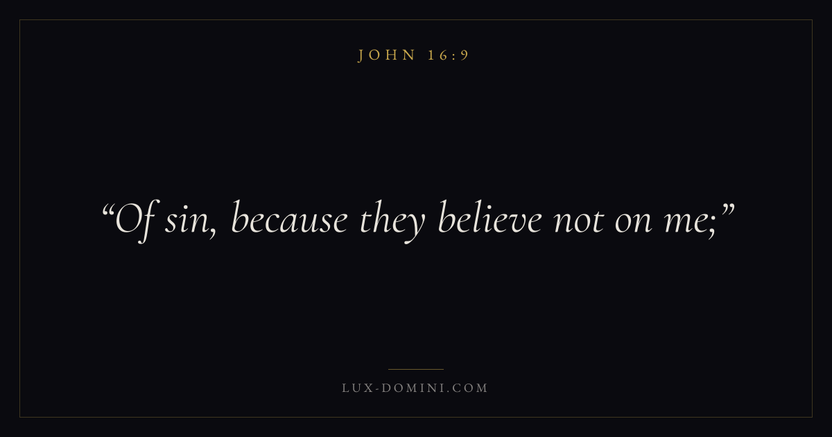 Books / John / Chapter 16 / Verse 9 ← John 16:8 John 16:9 John 16:10 → Of sin, because they believe not on me; Download verse card Share on Twitter Share on Facebook Pin it ✦ Key themes LoveFaithTruthIncarnation Read with John 16:7John 16:8John 3:161 Corinthians 13:4 Related topics Bible verses about loveBible verses about faithBible verses about truth ✦ John Chapter 16 verses V. 1 V. 2 V. 3 V. 4 V. 5 V. 6 V. 7 V. 8 V. 9 V. 10 V. 11 V. 12 V. 13 V. 14 V. 15 V. 16 V. 17 V. 18 V. 19 V. 20 V. 21 V. 22 V. 23 V. 24 V. 25 V. 26 V. 27 V. 28 V. 29 V. 30 V. 31 V. 32 V. 33