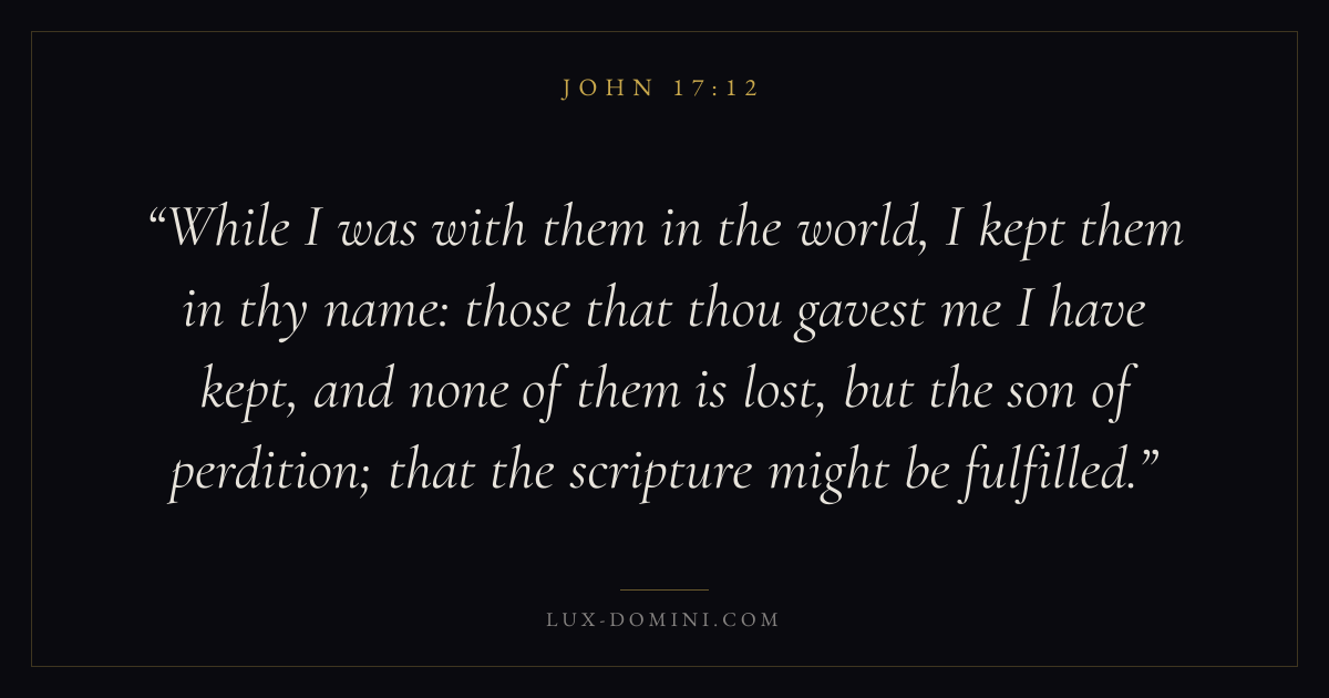 While I was with them in the world, I kept them in thy name: those that thou gavest me I have kept, and none of them is lost, but the son of perdition; that the scripture might be fulfilled.