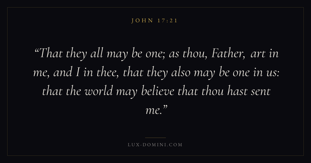 That they all may be one; as thou, Father, art in me, and I in thee, that they also may be one in us: that the world may believe that thou hast sent me.