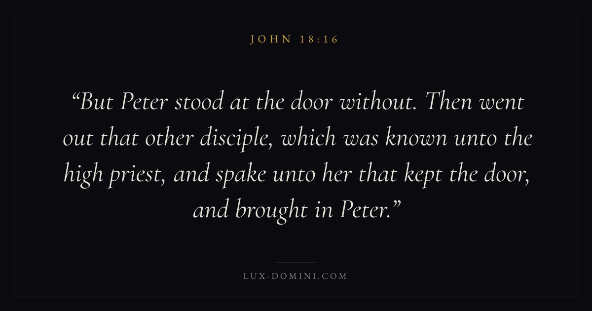 But Peter stood at the door without. Then went out that other disciple, which was known unto the high priest, and spake unto her that kept the door, and brought in Peter.