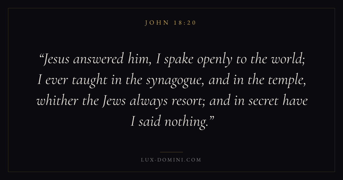 Jesus answered him, I spake openly to the world; I ever taught in the synagogue, and in the temple, whither the Jews always resort; and in secret have I said nothing.
