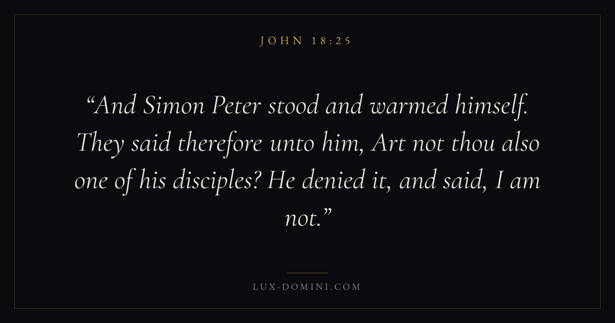 And Simon Peter stood and warmed himself. They said therefore unto him, Art not thou also one of his disciples? He denied it, and said, I am not.