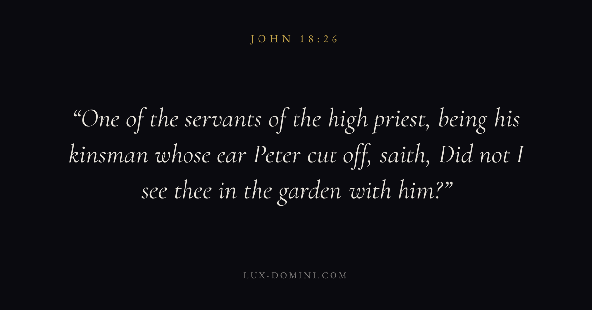 One of the servants of the high priest, being his kinsman whose ear Peter cut off, saith, Did not I see thee in the garden with him?