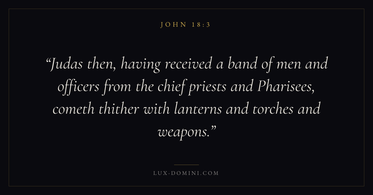 Judas then, having received a band of men and officers from the chief priests and Pharisees, cometh thither with lanterns and torches and weapons.