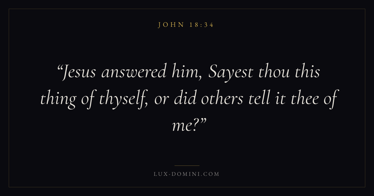 Books / John / Chapter 18 / Verse 34 ← John 18:33 John 18:34 John 18:35 → Jesus answered him, Sayest thou this thing of thyself, or did others tell it thee of me? Download verse card Share on Twitter Share on Facebook Pin it ✦ Key themes LoveFaithTruthIncarnation Read with John 18:35John 3:161 Corinthians 13:4Hebrews 11:1 Related topics Bible verses about loveBible verses about faithBible verses about truth ✦ John Chapter 18 verses V. 1 V. 2 V. 3 V. 4 V. 5 V. 6 V. 7 V. 8 V. 9 V. 10 V. 11 V. 12 V. 13 V. 14 V. 15 V. 16 V. 17 V. 18 V. 19 V. 20 V. 21 V. 22 V. 23 V. 24 V. 25 V. 26 V. 27 V. 28 V. 29 V. 30 V. 31 V. 32 V. 33 V. 34 V. 35 V. 36 V. 37 V. 38 V. 39 V. 40