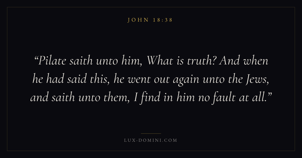 Pilate saith unto him, What is truth? And when he had said this, he went out again unto the Jews, and saith unto them, I find in him no fault at all.