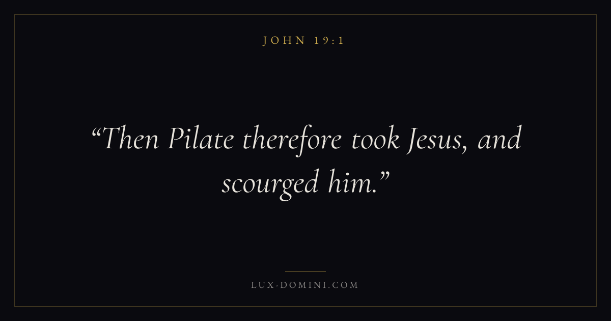 Books / John / Chapter 19 / Verse 1 ← John 18:40 John 19:1 John 19:2 → Then Pilate therefore took Jesus, and scourged him. Download verse card Share on Twitter Share on Facebook Pin it ✦ Key themes LoveFaithTruthIncarnation Read with John 19:2John 19:3John 3:161 Corinthians 13:4 Related topics Bible verses about loveBible verses about faithBible verses about truth ✦ John Chapter 19 verses V. 1 V. 2 V. 3 V. 4 V. 5 V. 6 V. 7 V. 8 V. 9 V. 10 V. 11 V. 12 V. 13 V. 14 V. 15 V. 16 V. 17 V. 18 V. 19 V. 20 V. 21 V. 22 V. 23 V. 24 V. 25 V. 26 V. 27 V. 28 V. 29 V. 30 V. 31 V. 32 V. 33 V. 34 V. 35 V. 36 V. 37 V. 38 V. 39 V. 40 V. 41 V. 42