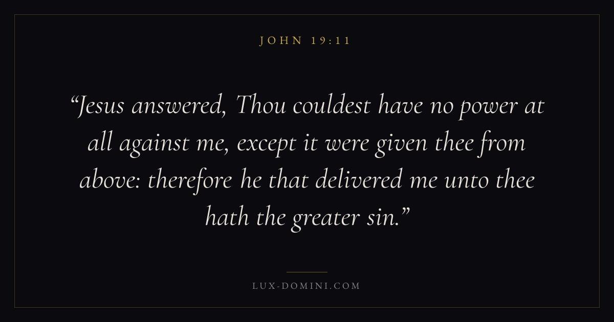 Jesus answered, Thou couldest have no power at all against me, except it were given thee from above: therefore he that delivered me unto thee hath the greater sin.