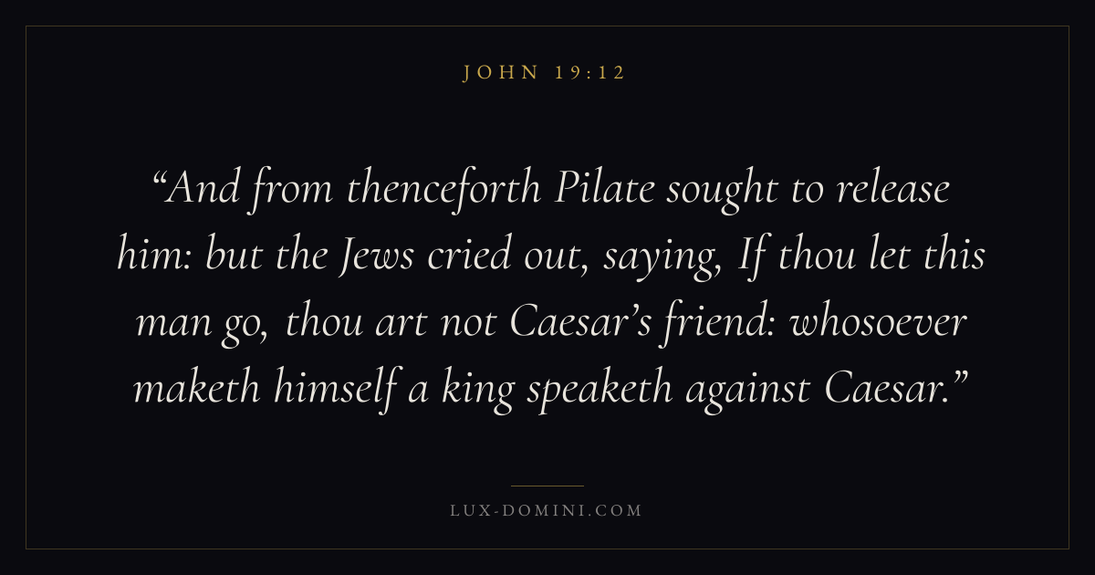 And from thenceforth Pilate sought to release him: but the Jews cried out, saying, If thou let this man go, thou art not Caesar’s friend: whosoever maketh himself a king speaketh against Caesar.