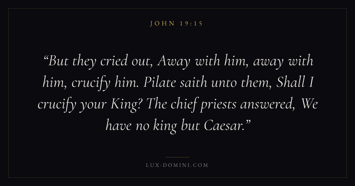 But they cried out, Away with him, away with him, crucify him. Pilate saith unto them, Shall I crucify your King? The chief priests answered, We have no king but Caesar.