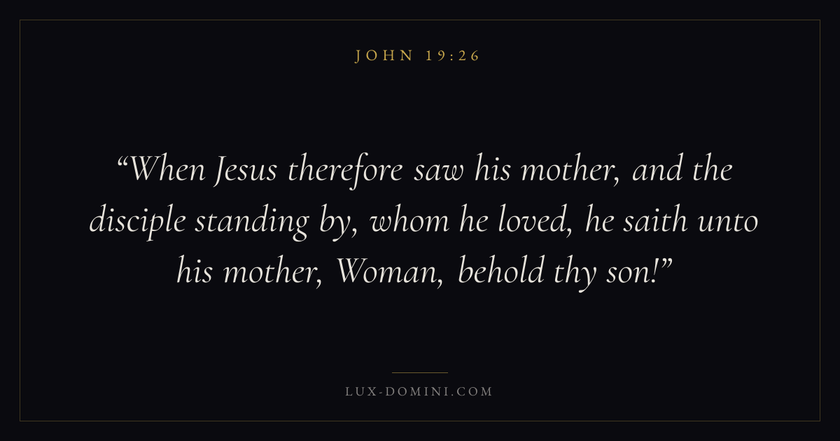 When Jesus therefore saw his mother, and the disciple standing by, whom he loved, he saith unto his mother, Woman, behold thy son!