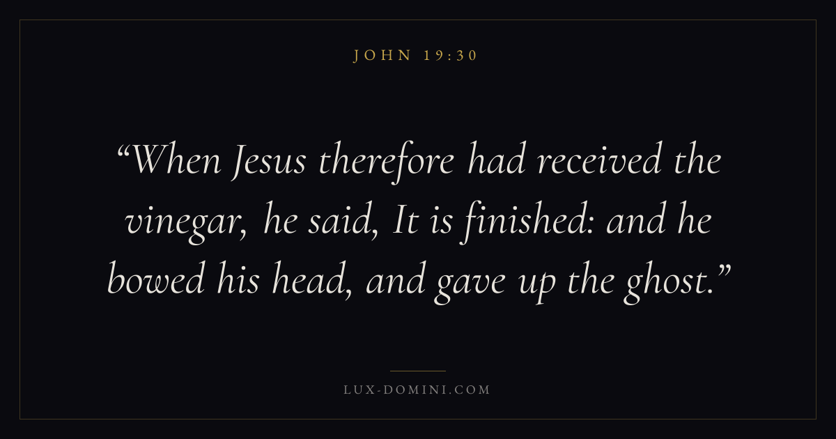 When Jesus therefore had received the vinegar, he said, It is finished: and he bowed his head, and gave up the ghost.