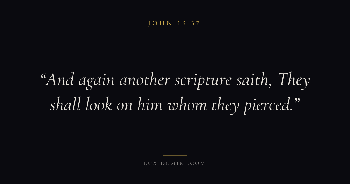 Books / John / Chapter 19 / Verse 37 ← John 19:36 John 19:37 John 19:38 → And again another scripture saith, They shall look on him whom they pierced. Download verse card Share on Twitter Share on Facebook Pin it ✦ Key themes LoveFaithSuffering and trialsTruthIncarnation Read with John 19:36John 3:161 Corinthians 13:4Hebrews 11:1 Related topics Bible verses about loveBible verses about faithBible verses about suffering and trialsBible verses about truth ✦ John Chapter 19 verses V. 1 V. 2 V. 3 V. 4 V. 5 V. 6 V. 7 V. 8 V. 9 V. 10 V. 11 V. 12 V. 13 V. 14 V. 15 V. 16 V. 17 V. 18 V. 19 V. 20 V. 21 V. 22 V. 23 V. 24 V. 25 V. 26 V. 27 V. 28 V. 29 V. 30 V. 31 V. 32 V. 33 V. 34 V. 35 V. 36 V. 37 V. 38 V. 39 V. 40 V. 41 V. 42