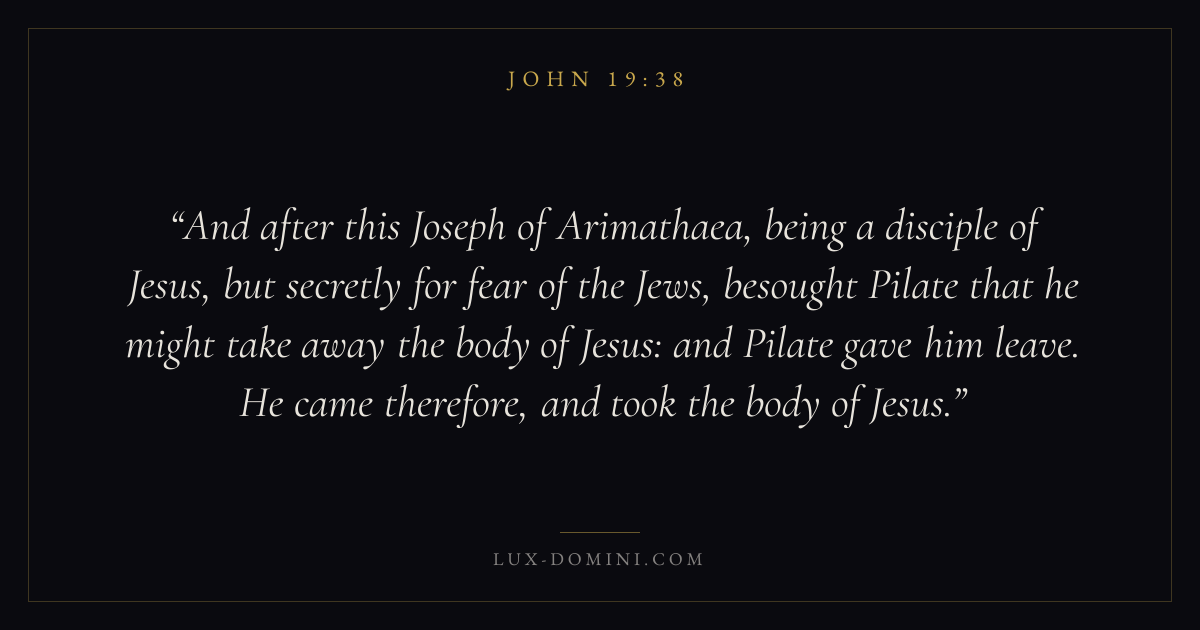 And after this Joseph of Arimathaea, being a disciple of Jesus, but secretly for fear of the Jews, besought Pilate that he might take away the body of Jesus: and Pilate gave him leave. He came therefore, and took the body of Jesus.