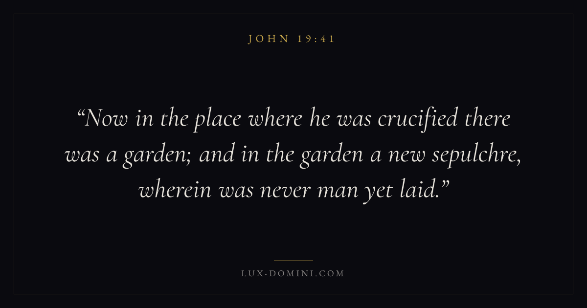 Now in the place where he was crucified there was a garden; and in the garden a new sepulchre, wherein was never man yet laid.