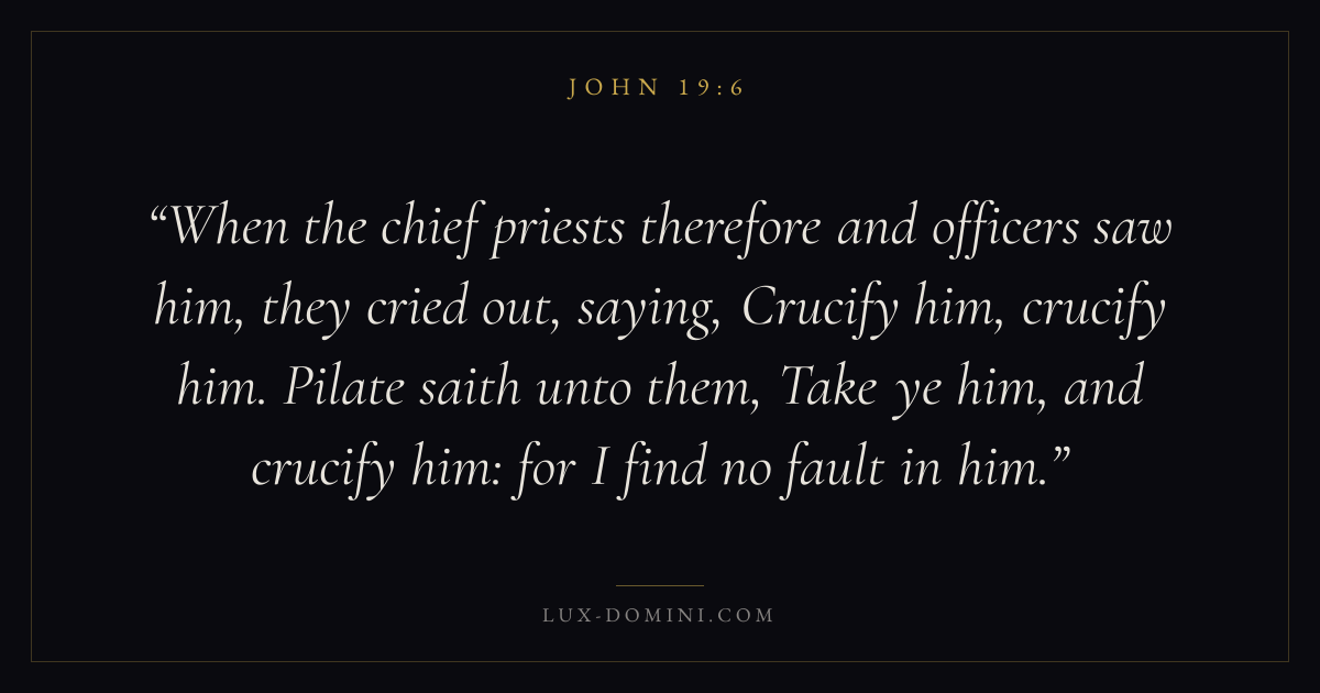 When the chief priests therefore and officers saw him, they cried out, saying, Crucify him, crucify him. Pilate saith unto them, Take ye him, and crucify him: for I find no fault in him.
