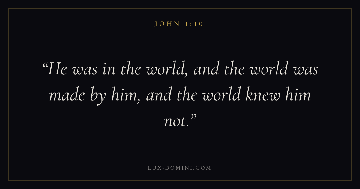 Books / John / Chapter 1 / Verse 10 ← John 1:9 John 1:10 John 1:11 → He was in the world, and the world was made by him, and the world knew him not. Download verse card Share on Twitter Share on Facebook Pin it ✦ Key themes LoveFaithTruthIncarnation Read with John 1:8John 1:9John 3:161 Corinthians 13:4 Related topics Bible verses about loveBible verses about faithBible verses about truth ✦ John Chapter 1 verses V. 1 V. 2 V. 3 V. 4 V. 5 V. 6 V. 7 V. 8 V. 9 V. 10 V. 11 V. 12 V. 13 V. 14 V. 15 V. 16 V. 17 V. 18 V. 19 V. 20 V. 21 V. 22 V. 23 V. 24 V. 25 V. 26 V. 27 V. 28 V. 29 V. 30 V. 31 V. 32 V. 33 V. 34 V. 35 V. 36 V. 37 V. 38 V. 39 V. 40 V. 41 V. 42 V. 43 V. 44 V. 45 V. 46 V. 47 V. 48 V. 49 V. 50 V. 51