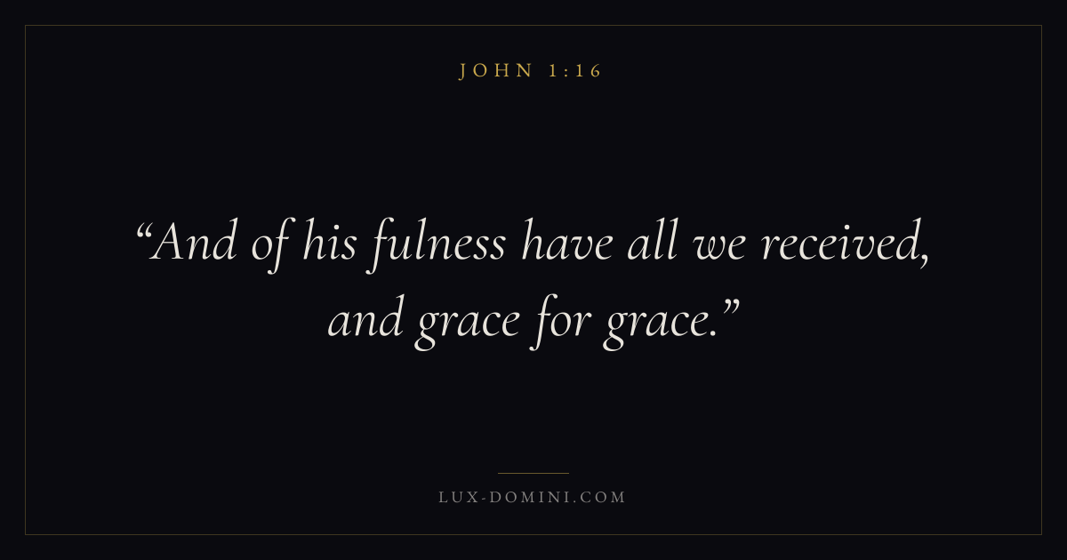 Books / John / Chapter 1 / Verse 16 ← John 1:15 John 1:16 John 1:17 → And of his fulness have all we received, and grace for grace. Download verse card Share on Twitter Share on Facebook Pin it ✦ Key themes LoveFaithGraceTruthIncarnation Read with John 1:15John 1:17John 3:161 Corinthians 13:4 Related topics Bible verses about loveBible verses about faithBible verses about graceBible verses about truth ✦ John Chapter 1 verses V. 1 V. 2 V. 3 V. 4 V. 5 V. 6 V. 7 V. 8 V. 9 V. 10 V. 11 V. 12 V. 13 V. 14 V. 15 V. 16 V. 17 V. 18 V. 19 V. 20 V. 21 V. 22 V. 23 V. 24 V. 25 V. 26 V. 27 V. 28 V. 29 V. 30 V. 31 V. 32 V. 33 V. 34 V. 35 V. 36 V. 37 V. 38 V. 39 V. 40 V. 41 V. 42 V. 43 V. 44 V. 45 V. 46 V. 47 V. 48 V. 49 V. 50 V. 51