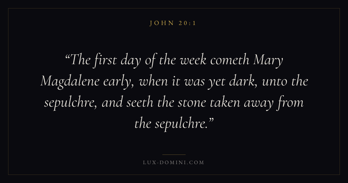 The first day of the week cometh Mary Magdalene early, when it was yet dark, unto the sepulchre, and seeth the stone taken away from the sepulchre.