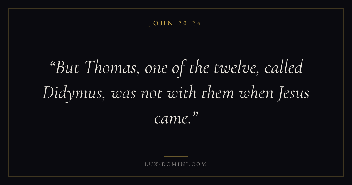 Books / John / Chapter 20 / Verse 24 ← John 20:23 John 20:24 John 20:25 → But Thomas, one of the twelve, called Didymus, was not with them when Jesus came. Download verse card Share on Twitter Share on Facebook Pin it ✦ Key themes LoveFaithEternal lifeTruthIncarnation Read with John 20:25John 3:161 Corinthians 13:4Hebrews 11:1 Related topics Bible verses about loveBible verses about faithBible verses about eternal lifeBible verses about truth ✦ John Chapter 20 verses V. 1 V. 2 V. 3 V. 4 V. 5 V. 6 V. 7 V. 8 V. 9 V. 10 V. 11 V. 12 V. 13 V. 14 V. 15 V. 16 V. 17 V. 18 V. 19 V. 20 V. 21 V. 22 V. 23 V. 24 V. 25 V. 26 V. 27 V. 28 V. 29 V. 30 V. 31