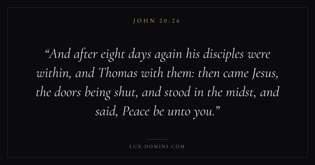 And after eight days again his disciples were within, and Thomas with them: then came Jesus, the doors being shut, and stood in the midst, and said, Peace be unto you.