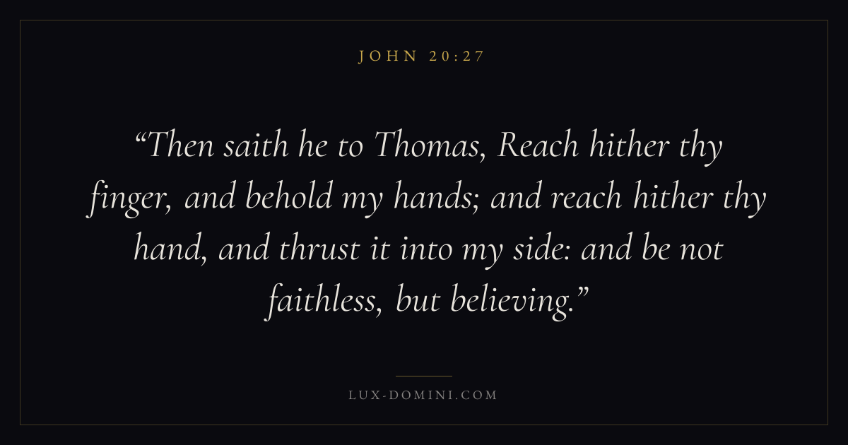 Then saith he to Thomas, Reach hither thy finger, and behold my hands; and reach hither thy hand, and thrust it into my side: and be not faithless, but believing.