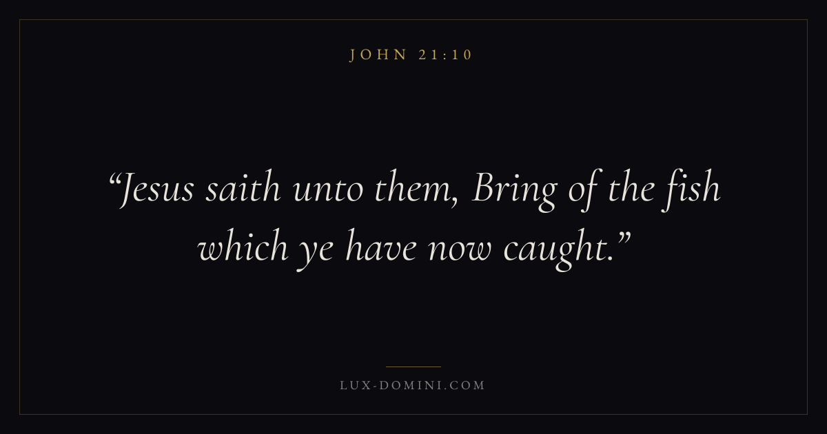 Books / John / Chapter 21 / Verse 10 ← John 21:9 John 21:10 John 21:11 → Jesus saith unto them, Bring of the fish which ye have now caught. Download verse card Share on Twitter Share on Facebook Pin it ✦ Key themes LoveFaithTruthIncarnation Read with John 21:11John 3:161 Corinthians 13:4Hebrews 11:1 Related topics Bible verses about loveBible verses about faithBible verses about truth ✦ John Chapter 21 verses V. 1 V. 2 V. 3 V. 4 V. 5 V. 6 V. 7 V. 8 V. 9 V. 10 V. 11 V. 12 V. 13 V. 14 V. 15 V. 16 V. 17 V. 18 V. 19 V. 20 V. 21 V. 22 V. 23 V. 24 V. 25