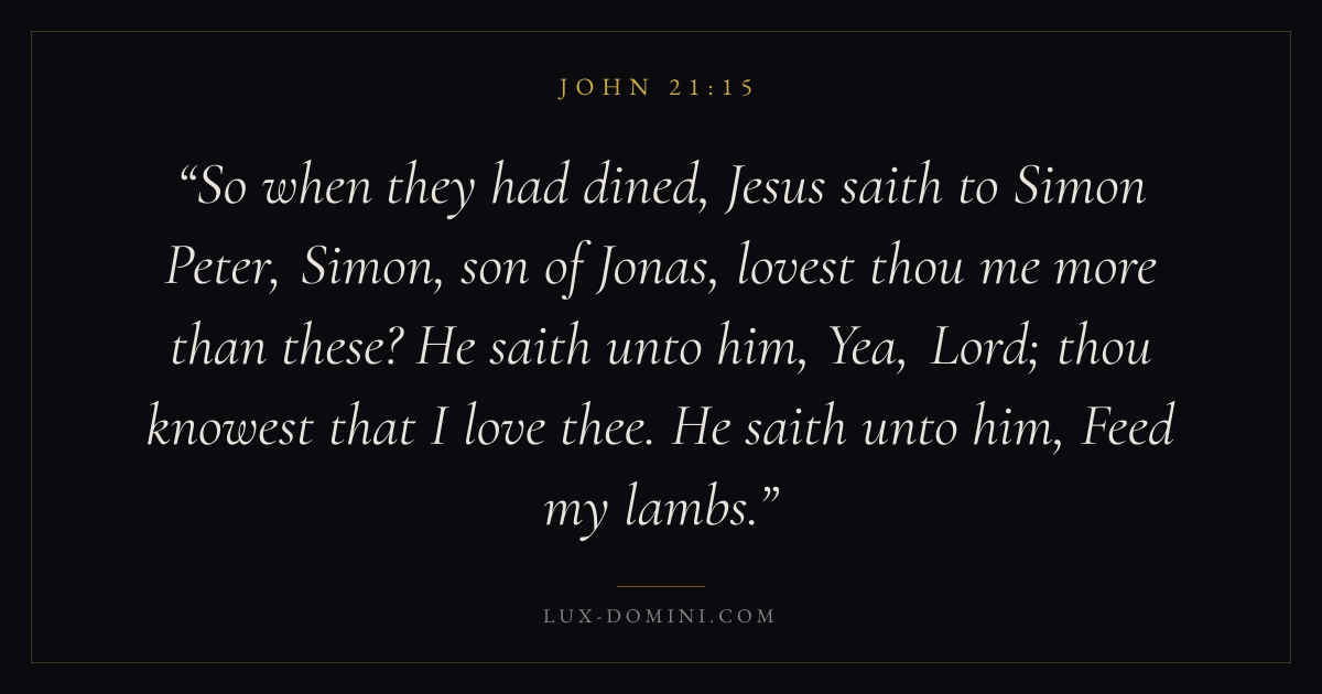 So when they had dined, Jesus saith to Simon Peter, Simon, son of Jonas, lovest thou me more than these? He saith unto him, Yea, Lord; thou knowest that I love thee. He saith unto him, Feed my lambs.