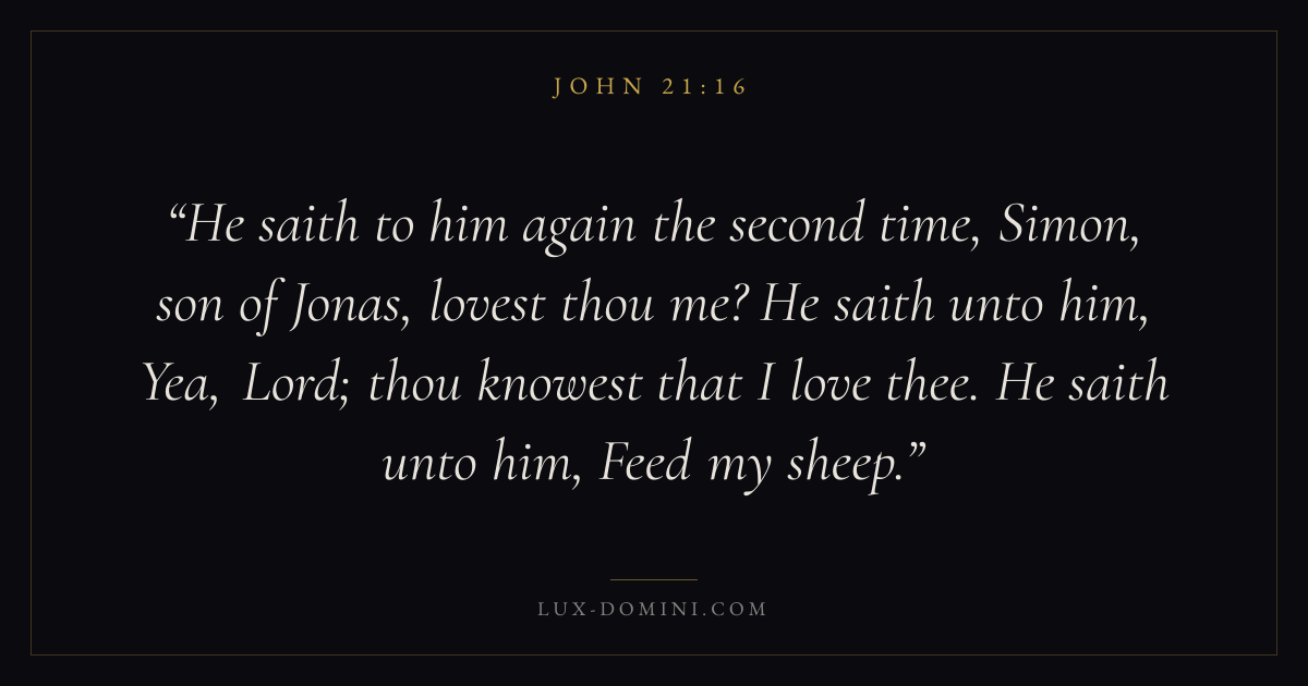 He saith to him again the second time, Simon, son of Jonas, lovest thou me? He saith unto him, Yea, Lord; thou knowest that I love thee. He saith unto him, Feed my sheep.