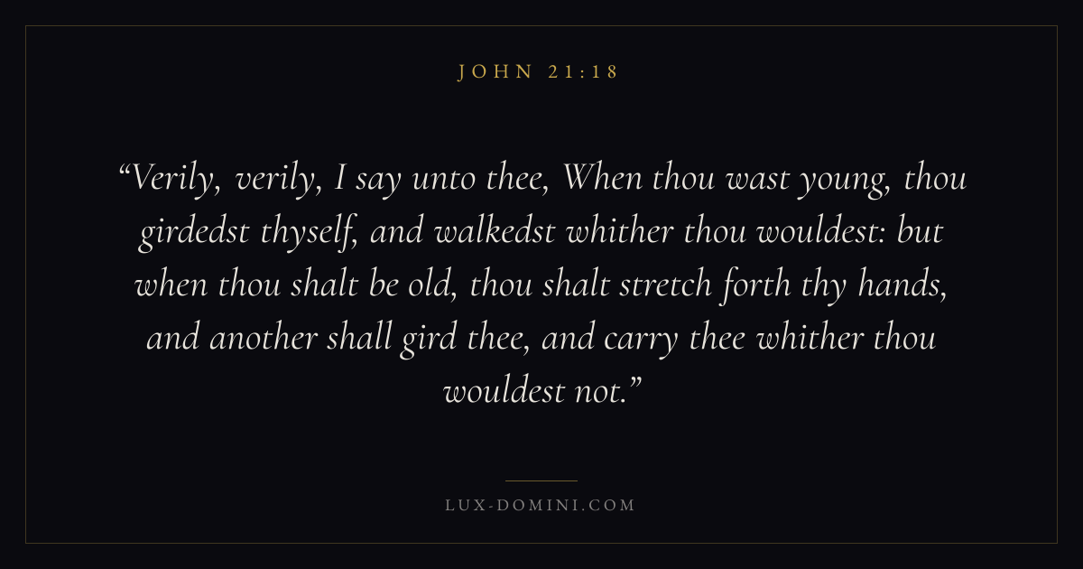 Verily, verily, I say unto thee, When thou wast young, thou girdedst thyself, and walkedst whither thou wouldest: but when thou shalt be old, thou shalt stretch forth thy hands, and another shall gird thee, and carry thee whither thou wouldest not.
