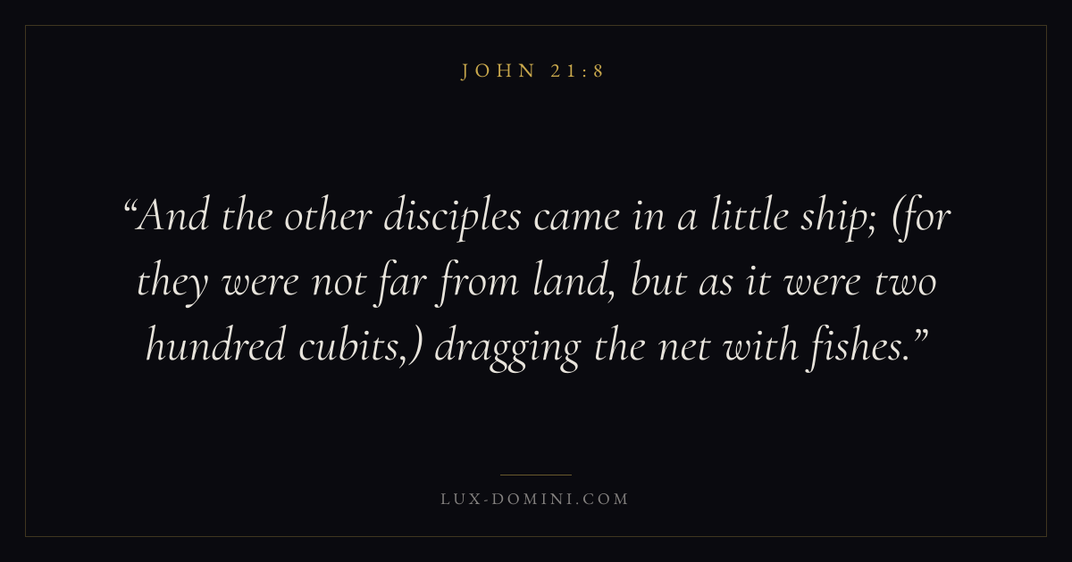 And the other disciples came in a little ship; (for they were not far from land, but as it were two hundred cubits,) dragging the net with fishes.