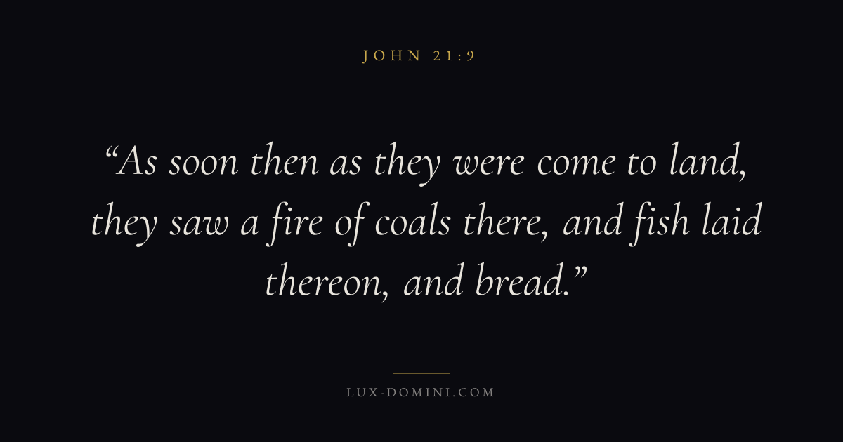 As soon then as they were come to land, they saw a fire of coals there, and fish laid thereon, and bread.