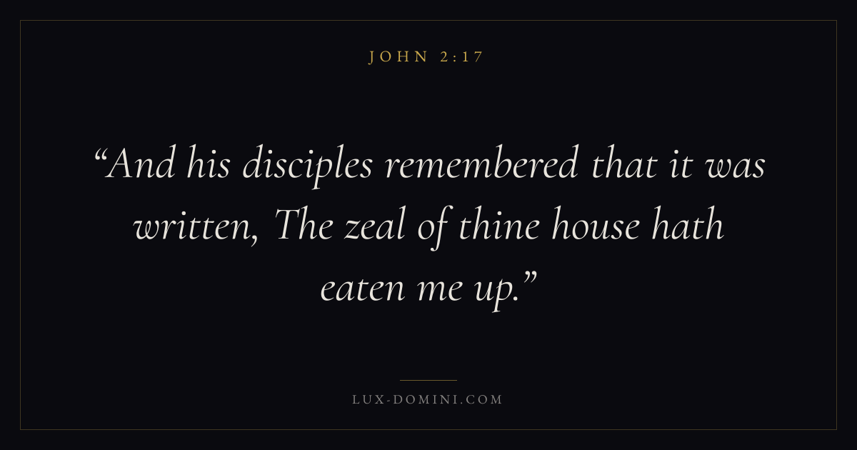 Books / John / Chapter 2 / Verse 17 ← John 2:16 John 2:17 John 2:18 → And his disciples remembered that it was written, The zeal of thine house hath eaten me up. Download verse card Share on Twitter Share on Facebook Pin it ✦ Key themes LoveFaithTruthIncarnation Read with John 2:13John 2:14John 3:161 Corinthians 13:4 Related topics Bible verses about loveBible verses about faithBible verses about truth ✦ John Chapter 2 verses V. 1 V. 2 V. 3 V. 4 V. 5 V. 6 V. 7 V. 8 V. 9 V. 10 V. 11 V. 12 V. 13 V. 14 V. 15 V. 16 V. 17 V. 18 V. 19 V. 20 V. 21 V. 22 V. 23 V. 24 V. 25