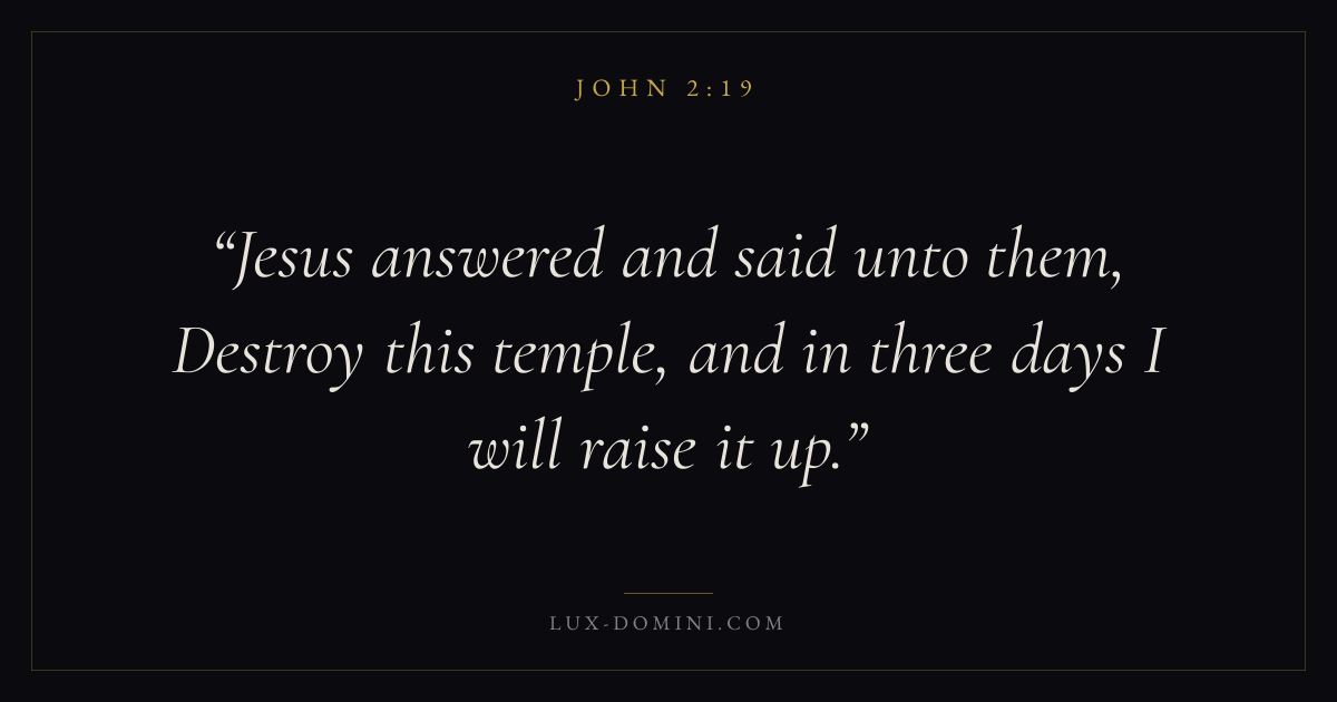 Books / John / Chapter 2 / Verse 19 ← John 2:18 John 2:19 John 2:20 → Jesus answered and said unto them, Destroy this temple, and in three days I will raise it up. Download verse card Share on Twitter Share on Facebook Pin it ✦ Key themes LoveFaithTruthIncarnation Read with John 2:18John 2:20John 3:161 Corinthians 13:4 Related topics Bible verses about loveBible verses about faithBible verses about truth ✦ John Chapter 2 verses V. 1 V. 2 V. 3 V. 4 V. 5 V. 6 V. 7 V. 8 V. 9 V. 10 V. 11 V. 12 V. 13 V. 14 V. 15 V. 16 V. 17 V. 18 V. 19 V. 20 V. 21 V. 22 V. 23 V. 24 V. 25