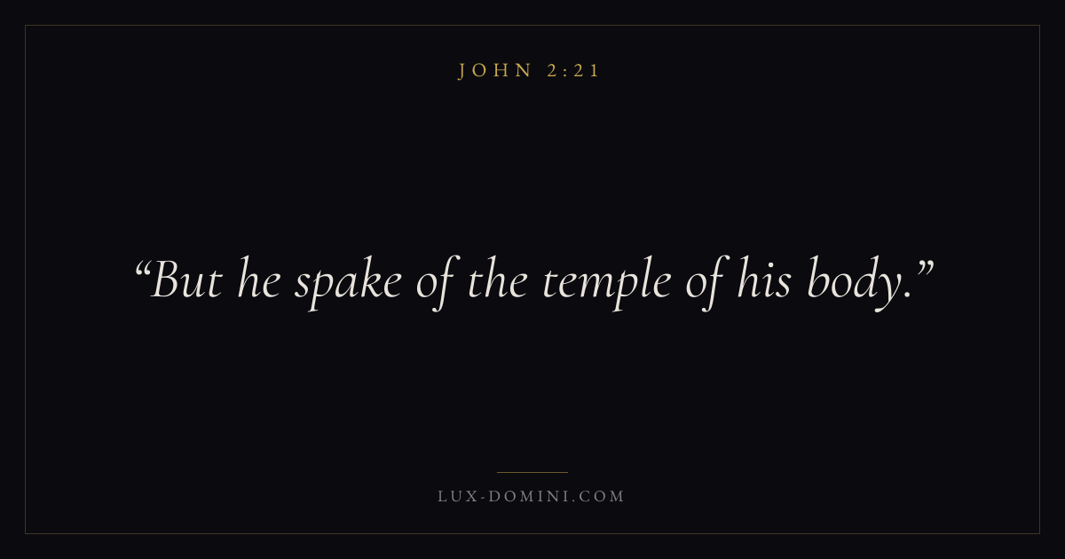 Books / John / Chapter 2 / Verse 21 ← John 2:20 John 2:21 John 2:22 → But he spake of the temple of his body. Download verse card Share on Twitter Share on Facebook Pin it ✦ Key themes LoveFaithTruthIncarnation Read with John 2:18John 2:19John 3:161 Corinthians 13:4 Related topics Bible verses about loveBible verses about faithBible verses about truth ✦ John Chapter 2 verses V. 1 V. 2 V. 3 V. 4 V. 5 V. 6 V. 7 V. 8 V. 9 V. 10 V. 11 V. 12 V. 13 V. 14 V. 15 V. 16 V. 17 V. 18 V. 19 V. 20 V. 21 V. 22 V. 23 V. 24 V. 25
