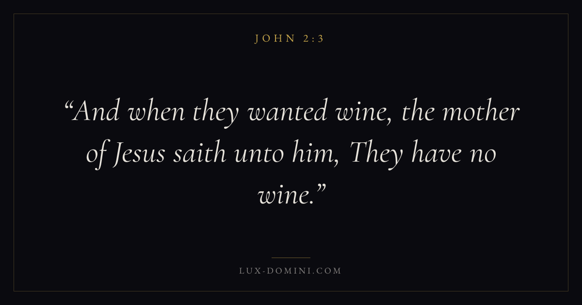Books / John / Chapter 2 / Verse 3 ← John 2:2 John 2:3 John 2:4 → And when they wanted wine, the mother of Jesus saith unto him, They have no wine. Download verse card Share on Twitter Share on Facebook Pin it ✦ Key themes LoveFaithPrayerTruthIncarnation Read with John 2:1John 2:2John 3:161 Corinthians 13:4 Related topics Bible verses about loveBible verses about faithBible verses about prayerBible verses about truth ✦ John Chapter 2 verses V. 1 V. 2 V. 3 V. 4 V. 5 V. 6 V. 7 V. 8 V. 9 V. 10 V. 11 V. 12 V. 13 V. 14 V. 15 V. 16 V. 17 V. 18 V. 19 V. 20 V. 21 V. 22 V. 23 V. 24 V. 25