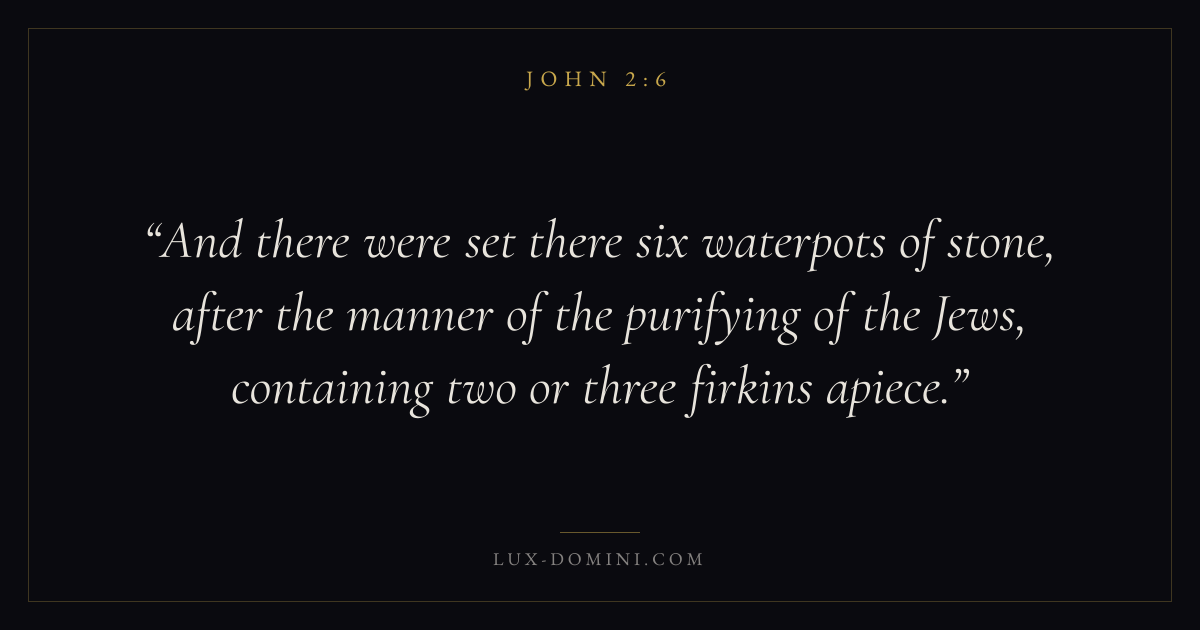 And there were set there six waterpots of stone, after the manner of the purifying of the Jews, containing two or three firkins apiece.