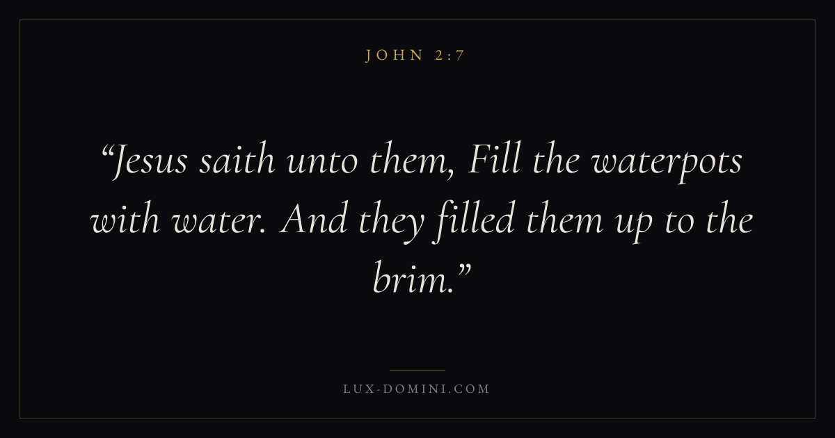 Books / John / Chapter 2 / Verse 7 ← John 2:6 John 2:7 John 2:8 → Jesus saith unto them, Fill the waterpots with water. And they filled them up to the brim. Download verse card Share on Twitter Share on Facebook Pin it ✦ Key themes LoveFaithPrayerTruthIncarnation Read with John 2:8John 3:161 Corinthians 13:4Hebrews 11:1 Related topics Bible verses about loveBible verses about faithBible verses about prayerBible verses about truth ✦ John Chapter 2 verses V. 1 V. 2 V. 3 V. 4 V. 5 V. 6 V. 7 V. 8 V. 9 V. 10 V. 11 V. 12 V. 13 V. 14 V. 15 V. 16 V. 17 V. 18 V. 19 V. 20 V. 21 V. 22 V. 23 V. 24 V. 25