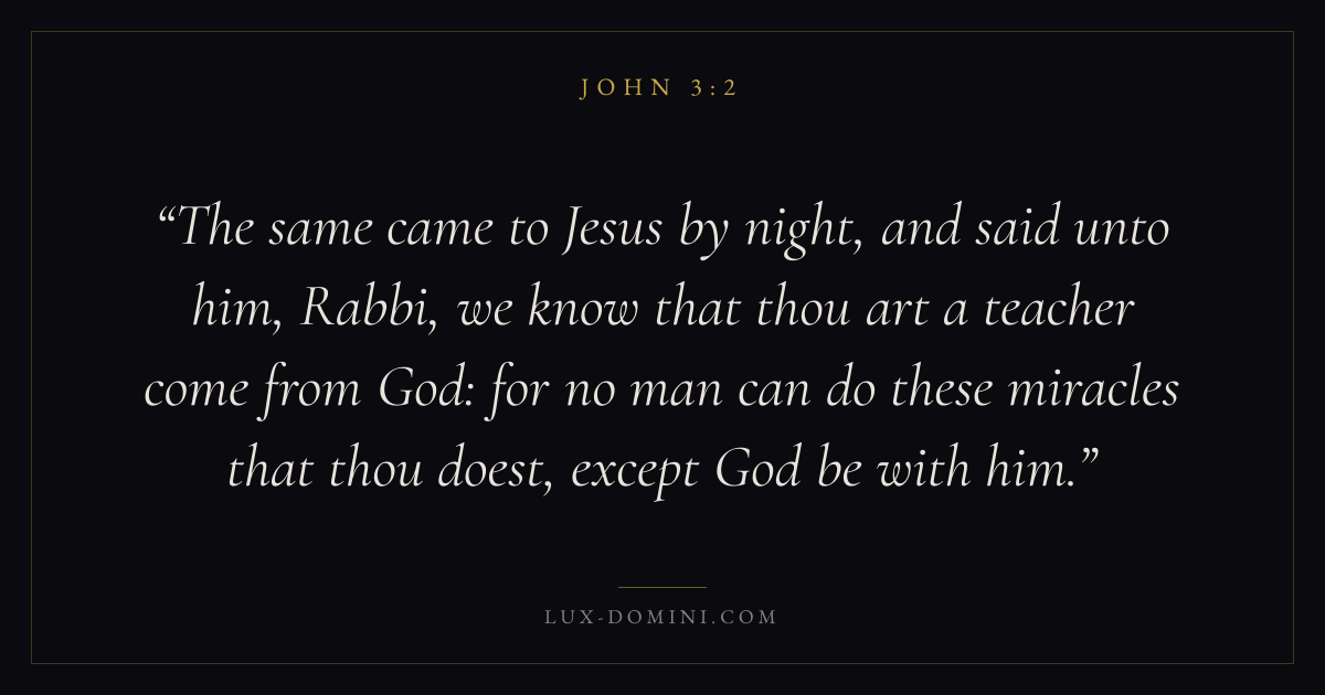 The same came to Jesus by night, and said unto him, Rabbi, we know that thou art a teacher come from God: for no man can do these miracles that thou doest, except God be with him.